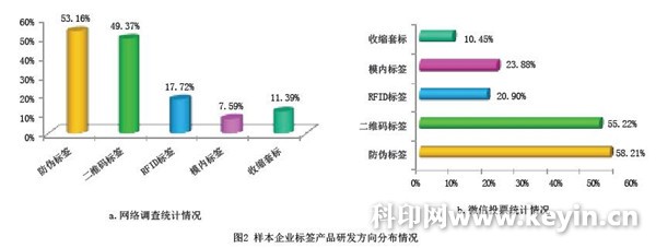 工藝技術創(chuàng)新在產(chǎn)品上的體現(xiàn),則主要集中于防偽標簽、溯源和物流追溯標簽、個性化促銷標簽等產(chǎn)品領域。網(wǎng)絡調查反饋情況是:53.16%的樣本企業(yè)將主要研發(fā)方向定位于防偽標簽,49.37%的樣本企業(yè)將可變信息二維碼標簽作為主要研發(fā)方向,17.72%的樣本企業(yè)將研發(fā)RFID標簽作為2016年的重點,7.59%的樣本企業(yè)在開發(fā)模內標簽,11.39%的樣本企業(yè)則在收縮套標領域深耕,見圖2-a。而微信投票的統(tǒng)計結果則如圖2-b所示,其中研發(fā)模內標簽的占比較之網(wǎng)絡調查結果更突出。