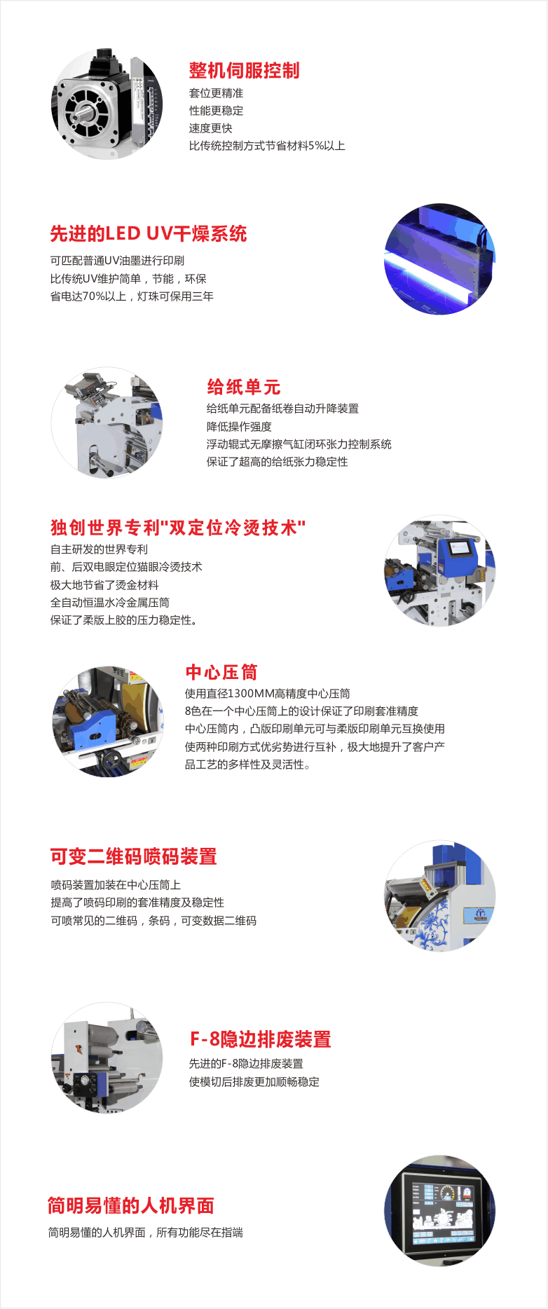 用途廣泛的靈活的印刷工藝組合;全伺服自動(dòng)控制,承印物適應(yīng)范圍寬闊,套準(zhǔn)精度高;操作簡(jiǎn)單,工作穩(wěn)定。