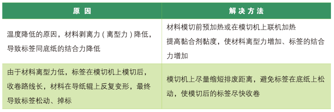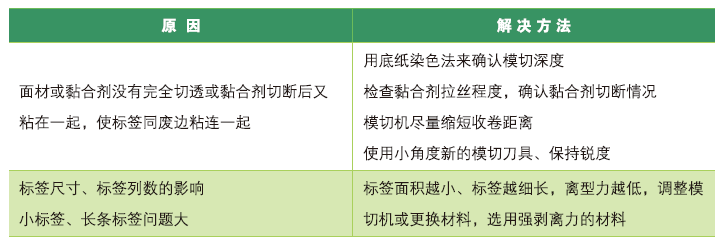 所謂模切掉標(biāo)(又稱飛標(biāo)),是指在模切過(guò)程中不干膠標(biāo)簽隨著排廢被帶起來(lái)的現(xiàn)象。在模切排廢過(guò)程中,不干膠材料離型力過(guò)低、模切處膠黏劑回黏、模切刀有破損或接口不齊等原因都會(huì)引起模切掉標(biāo)問(wèn)題,嚴(yán)重的模切掉標(biāo)現(xiàn)象不僅會(huì)造成原材料浪費(fèi),還會(huì)給后工序帶來(lái)許多麻煩。那么,究竟該怎樣降低模切飛標(biāo)問(wèn)題的產(chǎn)生呢?